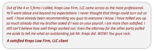 At Kreps Law Firm,LLC, we focus our practice on speeding, reckless driving, running a red light or stop sign, and speeding 25 over. It is our goal to make sure our clients get the best results possible in their cases. Call Kreps NOW at (866) 348-2889 or CLICK HERE to begin the process of fighting your traffic charge.